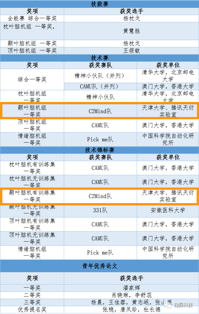 由国家自然科学基金委员会指导、中国电子学会联合有关单位主办的 “2020世界机器人大赛-BCI脑控机器人大赛”于2020年12月3-6日举行,天津大学高忠科教授团队和腾讯天衍实验室组成的C2Mind战队,经过多轮赛程的激烈比拼,实力入围BCI脑控机器人大赛“运动想象范式”赛题决赛,最终成功斩获技术赛“颞叶脑机组”一等奖,以及技术锦标赛“颞叶脑机有训练集一等奖”两项冠军。